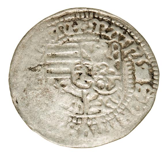 awers: pięciopolowa tarcza herbowa: rzeki węgierskie, lew czeski, byk łużycki, orzeł śląski i w środku kruk,